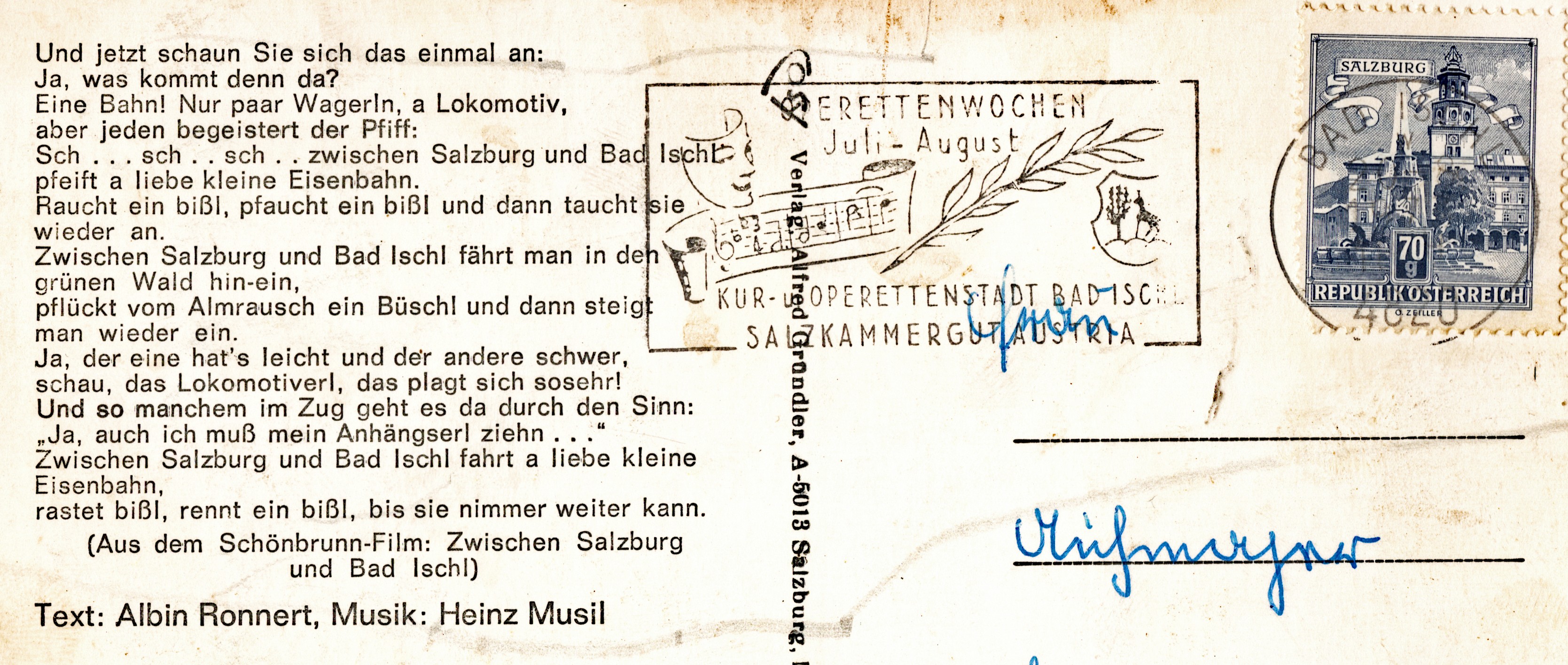 Dass die Salzkammergutlokalbahn immer noch die weltweit bekannteste Eisenbahn ist, mag mehrere Gründe haben. Grundsätzlich hat die Bevölkerung es bis heute nicht verstanden und schon gar nicht verwunden, dass es diese „geliebte“ Bahn nicht mehr gibt, obwohl sie eine wichtige Mobilitätsaufgabe hätte! Ein weiteres Faktum dürfte sein, dass es eine Fülle von originalen Filmaufnahmen, v.a. von amerikanischen Besatzungs-Soldaten, gibt, wobei der Spielfilm von Franz Antel „Kaiserball“ 1956 wohl eine herausragende Rolle hat. In diesem Musik- und Liebesfilm hat das Lied „Zwischen Salzburg und Bad Ischl“ eine zentrale Bedeutung.